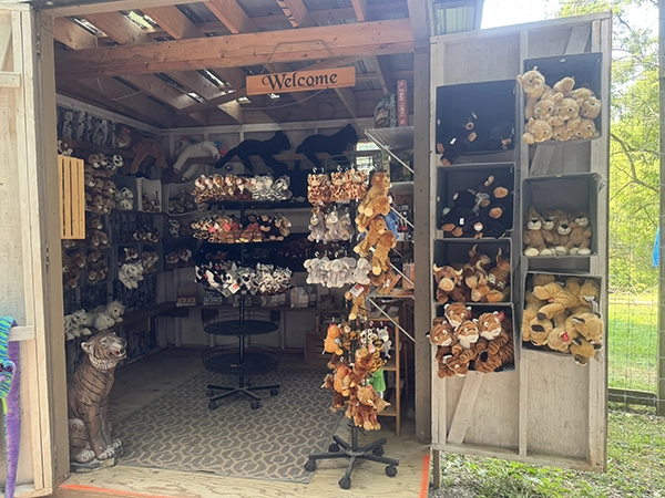 - GIFT SHOP and SLEUTH – We have three small buildings that consist of our gift shop area. We have a variety of toys, plush, shirts and other novelty items for all ages. Enjoy feeding the animals! You can buy a bag of shelled peanuts for $5 which you can feed to some of our animals during your visit. Please be aware if you have a nut allergy as there often will be peanuts and the brown bags they come in throughout our zoo. We also have a water powered sleuth where you can pan handle for gold flakes, fossils, gems and rocks starting at $12 a bag. Great for kids of all ages.